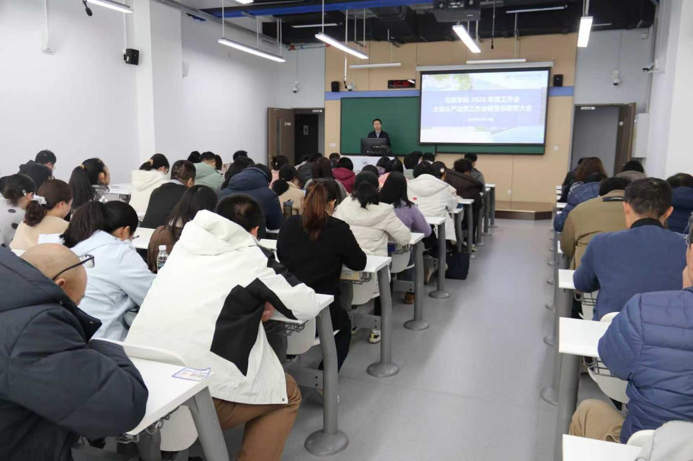 (通讯员 刘雯嘉 张芳芳)3月18日下午,美女自慰 召开2026年度工作会、全面从严治党工作会暨警示教育大会,学习传达学校2026年度工作会、全面从严治党工作会暨警示教育大会精神,部署美女自慰2026年重点工作,并对树立和践行正确政绩观学习教育工作进行动员安排。美女自慰 全体教职工参加会议,会议由美女自慰党委书记宋晓东主持。