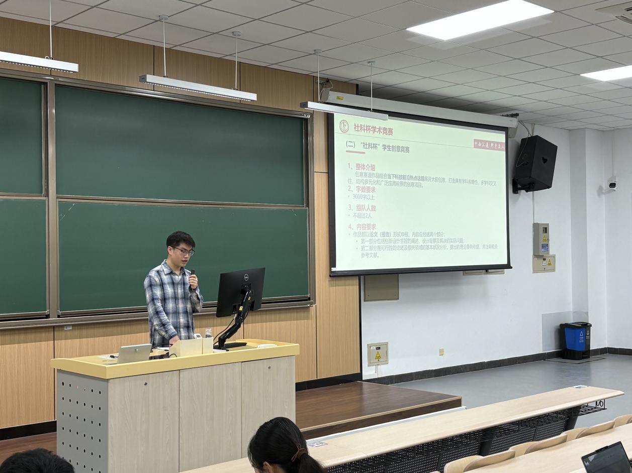 辅导员乔元廷为同学们系统梳理了“社科杯”“冯如杯”竞赛的赛道特点、时间节点与具体要求,并鼓励同学们积极参与,在实践中培养创新思维与科研能力。